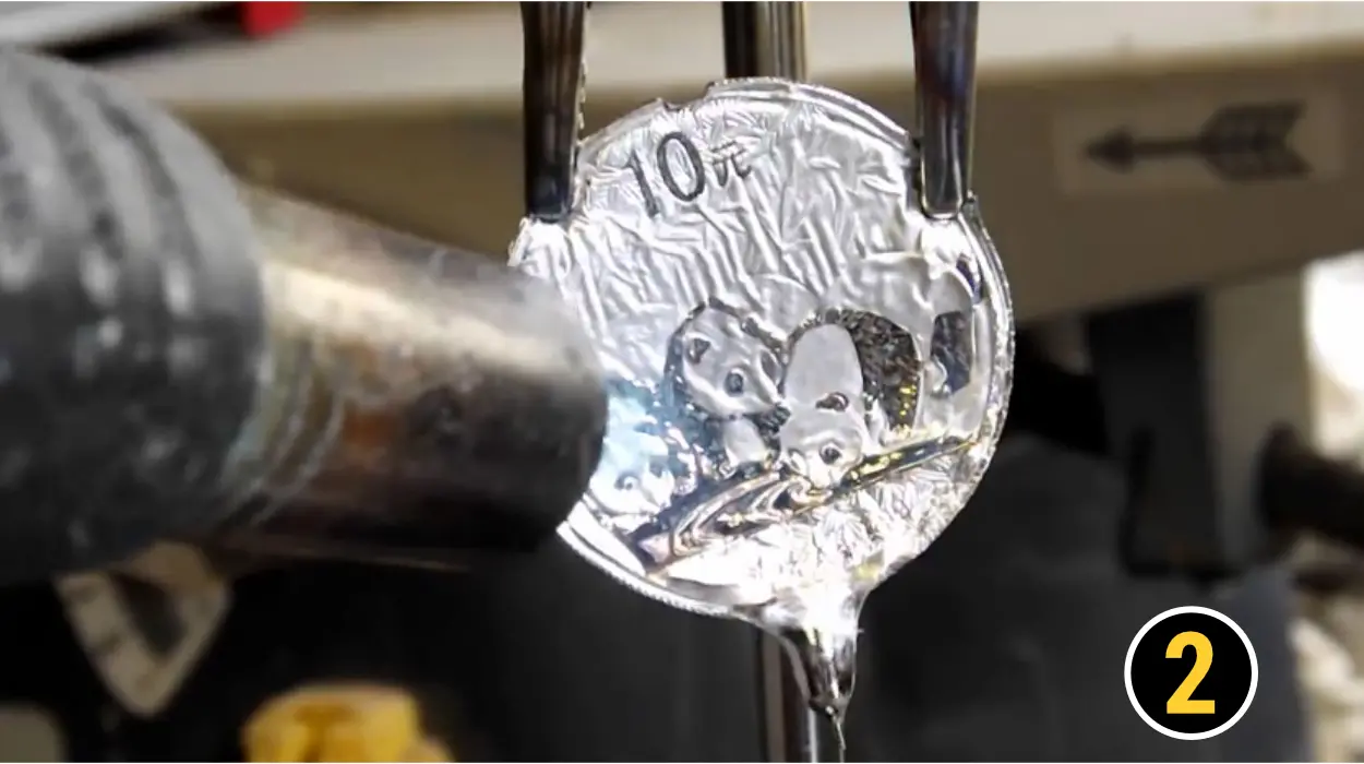 Die nachfolgenden Bilder verdeutlichen, wie täuschend echt Fälschungen wirken können. Unter einer dünnen Silberhülle verbirgt sich hier ein Kern aus Blei-Zinn, der sogar zusätzlich verkupfert wurde, um die Oberfläche besser versilbern zu können. Beim Schmelzen wird die wahre Zusammensetzung aber sichtbar – im Vergleich zur echten Silber-Panda-Münze ein klarer Unterschied.