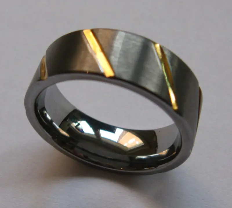 Hier wurde derselbe Ring mit einer 20 µm starken Goldschicht überzogen. Durch die Vergoldung erhält er ein völlig anderes Erscheinungsbild – elegant und edel, bei gleichzeitig unveränderter Stabilität des Wolframcarbid-Kerns.