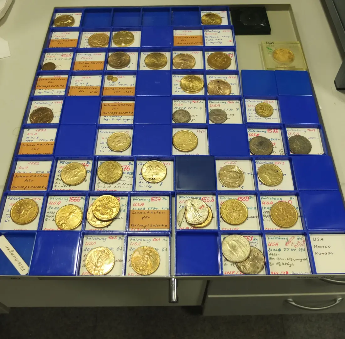 Auswahl an gefälschten Münzen im Bestand der Bundesbank Mainz.