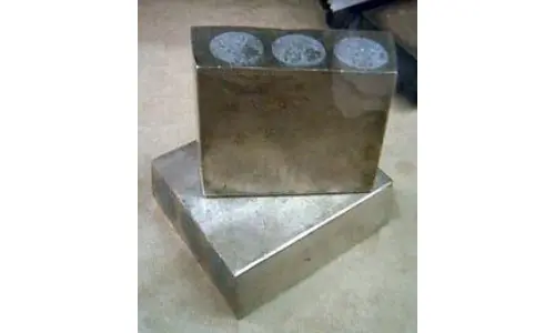 Aufgeschnittener gefälschter Silberbarren mit Blei-Zinn-Kern.