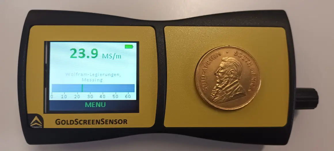 Um kleine Barren (bis circa 50 g) zerstörungsfrei auf das Vorliegen dichte-gleicher Fälschungsmaterialien zu untersuchen, ist mindestens eine weitere Prüfmethode nötig. Eine hervorragende Möglichkeit, um bis zu einer gewissen Tiefe unter die Oberfläche solcher möglichen Fälschungen zu sehen, ist die Wirbelstrommessung. Mit dieser Methode ist es möglich, die elektrische Leitfähigkeit im Inneren von Edelmetallen zu ermitteln. Das Ergebnis der Leitfähigkeitsmessung wird vom GoldScreenSensor mit den jeweiligen "Soll"-Wert abgeglichen. Treten hier Abweichungen auf, hat man klare Hinweise auf eine potenzielle Goldfälschung. Glücklicherweise haben alle uns bekannten Fälschungsmaterialien mit gleicher Dichte einen von Reingold abweichenden Leitwert (angegeben in der physikalischen Einheit Megasiemens pro Meter [MS/m]). Somit können diese tückischen Imitate mit dem Goldanalytix GoldScreenSensor oder dem GoldScreenPen identifiziert werden (wie sie z.B. 2022 in Köln in Umlauf geraten sind.) Beachten Sie aber unbedingt die jeweiligen Eindringtiefen in die unterschiedlichen Edelmetalle. Denn nur bis zu diesen Grenzen ist es möglich Abweichungen durch ein Fremdmaterial festzustellen. Bei Silber beispielsweise beträgt die Eindringtiefe des GoldScreenSensors circa 250 µm - dies ist zwar viel wenn man bedenkt, dass die meisten Beschichtungen lediglich 20 µm dick sind und somit sehr viele Fälschungen bis meist circa 1 Unze identifiziert werden können. Bei größeren Objekten wie einem 100 Gramm oder gar 1-Kilogramm Barren hingegen wäre es durchaus denkbar, dass die Fälscher dickere Schichten auftragen und daher wäre eine Prüfung allein mit dem GoldScreenSensor oder dem GoldScreenPen nicht ausreichend.