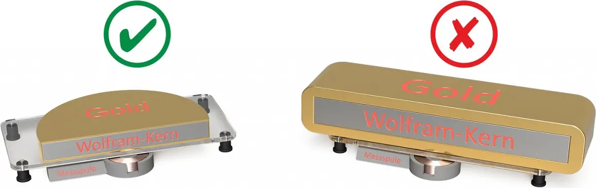 Wie in der Illustration zu sehen ist, können die Objekte gleiches Gewicht und Volumen besitzen, doch die unterschiedliche geometrische Anordnung bewirkt gänzlich verschiedene Ausgangslagen. Daher ist es schwierig ein pauschales Urteil zur maximal messbaren Objektgröße abzugeben - beispielsweise ein dünnes Goldband (oft als Vorstufe für die Blattgoldproduktion hergestellt) kann mehrere Kilogramm wiegen und ist dennoch gut mit dem GoldScreenSensor messbar. Grob lässt sich allerdings sagen, dass der GoldScreenSensor ideal im Bereich von 1 bis 31,1 g eingesetzt wird. Es können natürlich auch größere Objekte geprüft werden, jedoch immer unter Beachtung der voran beschriebenen Einschränkungen. Ein großer Teil der uns bekannten Fälschungen ist in der Tat derart gemacht, dass sie nur von einer dünnen Beschichtung des jeweiligen Materials überzogen sind und somit erkannt werden können.