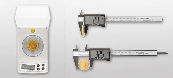 Bei den Münzen ist es in der Regel einfacher als bei Barren, die korrekten Referenzabmessungen zu ermitteln und diese mit der vorliegenden Münze abzugleichen. Das Gewicht ist durch die meist klare Einordnung in die Größen 1/10 Unze, 1/4 Unze, 1/2 Unze und 1 Unze definiert. Beachten Sie, dass bei legierten Münzen wie beispielsweise der 1-Unze-Krügerrand-Münze der Feingoldanteil entsprechend 1 Unze (also 31,1 g) beträgt, aber durch die Beimischung von Kupfer oder Kupfer/Silber (zur Erhöhung der Kratzfestigkeit) das Gesamtgewicht höher liegt (z.B beim Krügerrand 33,95 g). Die Angabe "1 Unze" bezieht sich eigentlich immer auf den tatsächlichen Feingoldanteil.