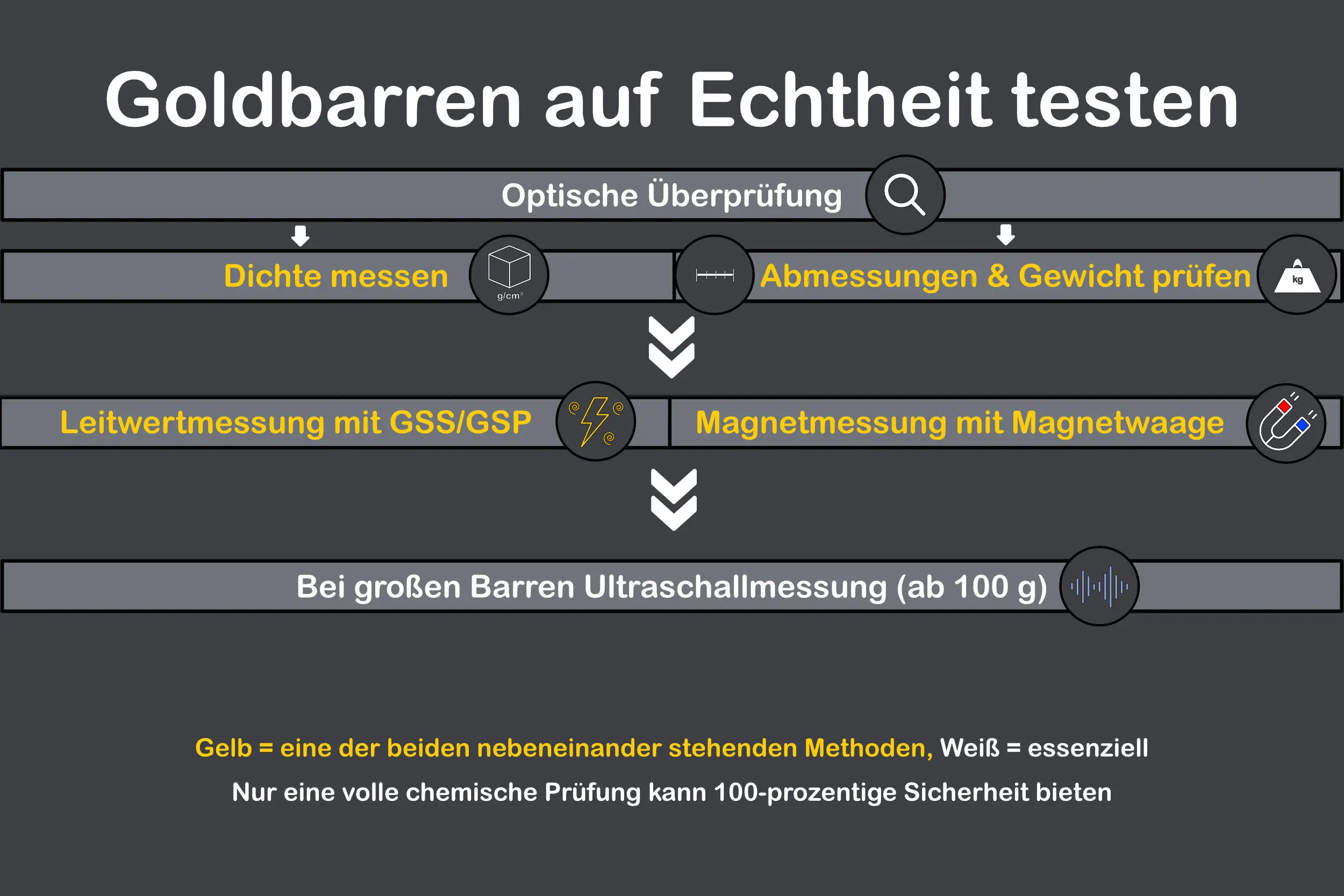 Trotz der hohen Genauigkeit der Goldprüfgeräte bleibt ein wichtiges Prinzip der Goldprüfung bestehen: Eine alleinstehende Prüfmethode kann zerstörungsfrei niemals alle Fälschungen identifizieren. Es ist immer eine Kombination aus mehreren Methoden (mindestens zwei, z.B. Dichte und Leitfähigkeit) ratsam. Die einzige Methode, die zweifelsfrei Auskunft über die vollständige Zusammensetzung auch im Inneren der Edelmetalle geben kann, ist der chemische Aufschluss (Auflösung in Säure) und die folgende Analyse. Doch ist hierfür die Zerstörung des Barrens nötig - nicht ideal für den geneigten Edelmetallanleger!