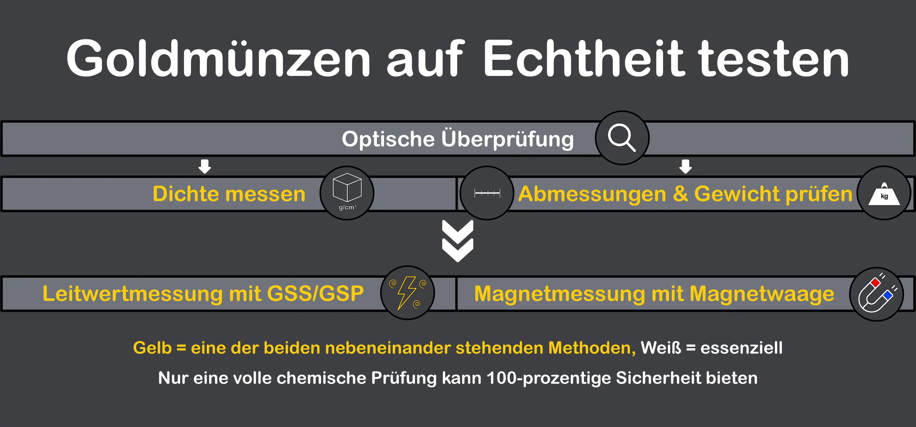 Für den Goldtest stehen zahlreiche Prüfmethoden zur Auswahl. Das optimale Vorgehen ist unter anderem abhängig von Geometrie, Beschaffenheit und Goldgehalt der Prüfobjekte. Je nachdem ob Goldschmuck, Goldbarren, Zahngold, Goldnuggets oder Goldmünzen geprüft werden sollen, können unterschiedliche Verfahren eingesetzt und kombiniert werden. In den folgenden 3 Abschnitten zeigen wir Ihnen das richtige Vorgehen zur Prüfung der Echtheit von Goldbarren, Goldmünzen und Goldschmuck. Falls Sie sich genauer zur Funktionsweise und Anwendung einzelner Prüfmethoden informieren möchten, können Sie über die Prüfmethodik-Icons zu dem jeweiligen Prüfgerät gelangen. Unsere Rubrik Münzabmessungen & Gewichte ist übrigens für das Nachschlagen von Abmessungen bei der Münzprüfung sehr hilfreich.