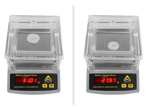 Auch das spezifische Gewicht bzw. die Dichte eines Metalls wie Silber kann Aufschluss über Materialreinheit und Beschaffenheit im Inneren des Objektes geben. Mittels Dichtewaage können Fälschungen aufgedeckt werden, bei denen das Kernmaterial von der Dichte des Silbers oder der Silberlegierung abweicht. Dies sind unter anderem die sehr häufig vorkommenden Silberfälschungen mit Kupferkern. Dazu wird das Objekt einmal außerhalb des Wassers (links) und einmal im Wasser (rechts) gewogen und die Werte in das mitgelieferte Excel-Tool eingegeben. Darüber hinaus können auch Blei-haltige Silberobjekte aufgedeckt werden und in seltenen Fällen solche mit Kernen aus anderen Metallen wie zum Beispiel Bismut. In der folgenden Übersicht ein Vergleich der Dichten zwischen Silber und den gängigen Fälschungsmaterialien: